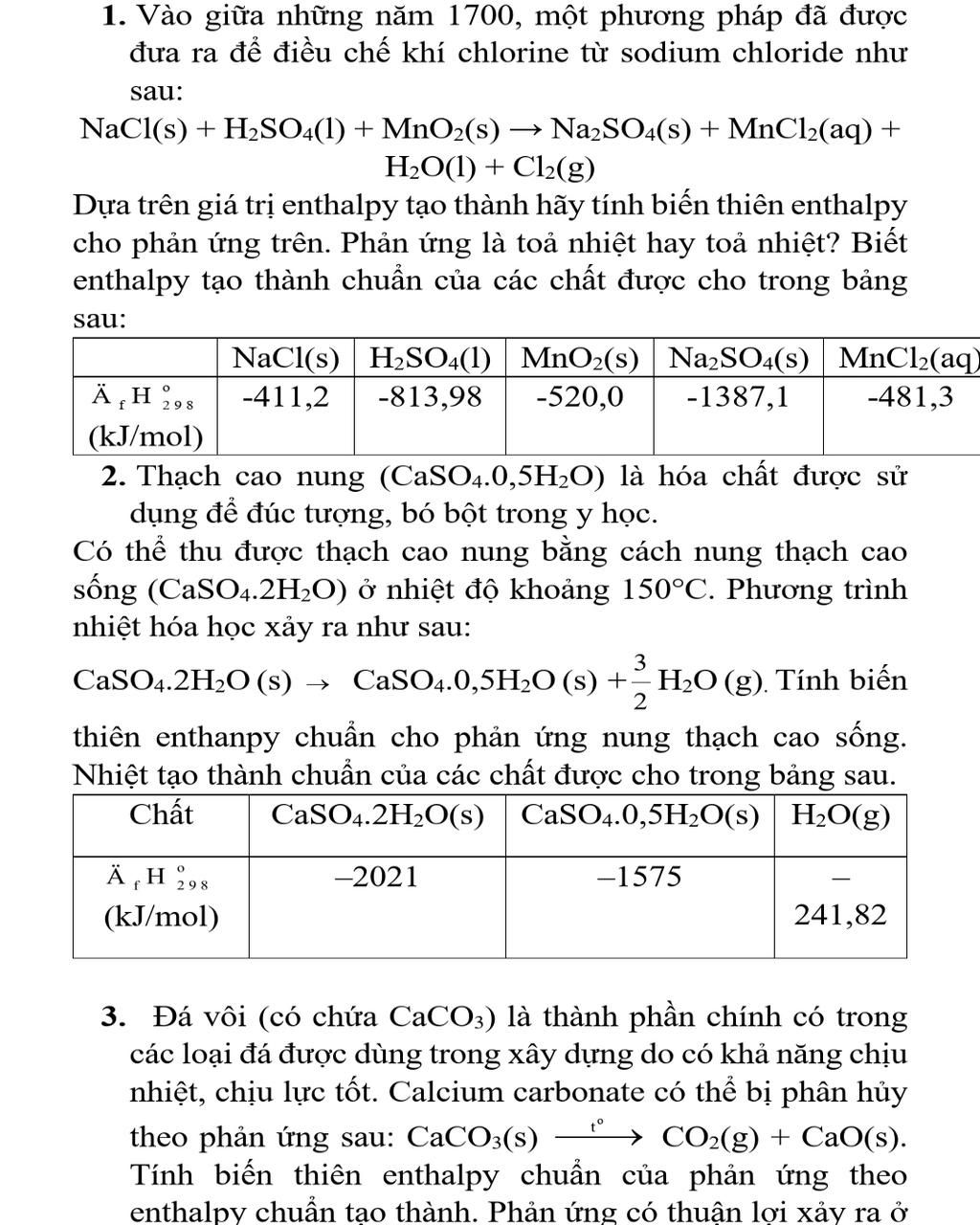\(\Delta _r^{}H_{298}^o = \Delta _f^{}H_{298}^o(CaSO_4^{}.0,5H_2^{}O) + \frac{3}{2}\Delta _f^{}H_{298}^o(H_2^{}O) - \Delta _f^{}H_{298}^o(CaSO_4^{}.2H_2^{}O)\)