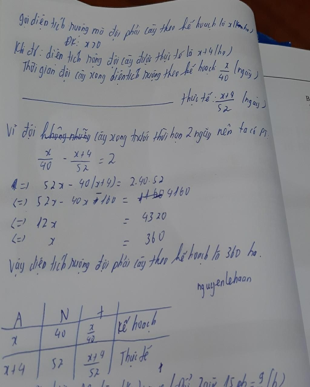 Diện tích ruộng phải cày theo kế hoạch là `40x` `(ha)`