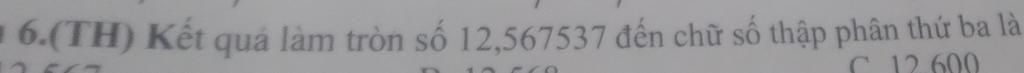 Làm tròn số `12,567537` đến số thập phân thứ ba là: