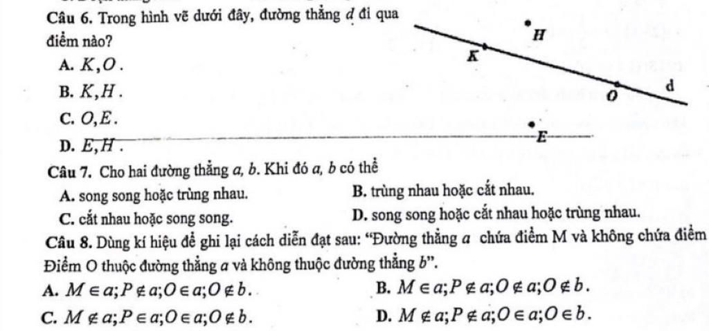 Câu 8: A, m thuộc a, p k thuộc a, O thuộc a, O k thuộc b.
