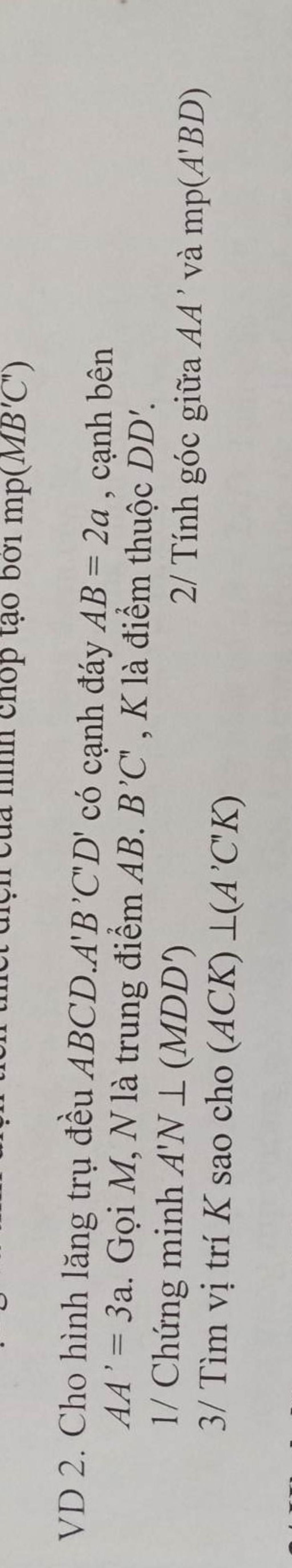 AA’= 3a. Gọi M, N là trung điểm AB. B’C' , K là điểm thuộc DD'.