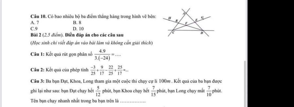 Câu 10. Có bao nhiêu bộ ba điểm thẳng hàng trong hình vẽ bên: