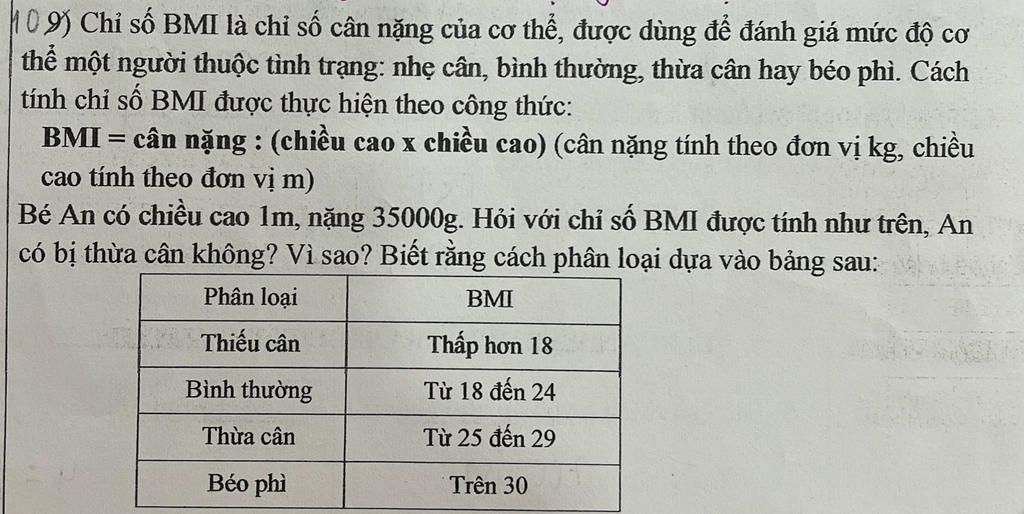 BMI= cân nặng : (chiều cao x chiều cao) (cân nặng tính theo đơn vị kg, chiều ...