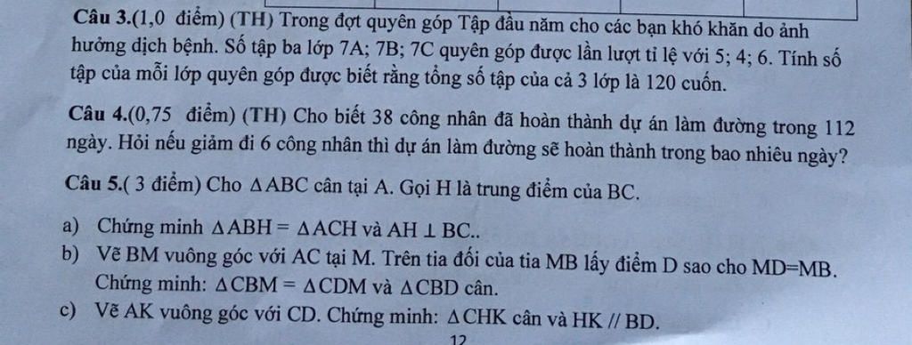 hưởng dịch bệnh. Số tập ba lớp 7A; 7B; 7C quyên góp được lần lượt tỉ lệ với 5; 4; 6. Tính số