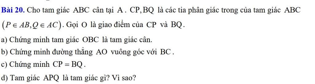 b) Vì O là giao điểm các tia phân giác CP và BQ trong AABC nên O là giao điểm ba đường phân, giác trong tâm giác ABC. Do đó, O cách đều ba cạnh của tam giác ABC.