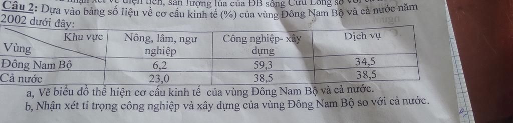 Câu 2: Dựa vào bảng số liệu về cơ cấu kinh tế (%) của vùng Đông Nam Bộ và cả nước năm