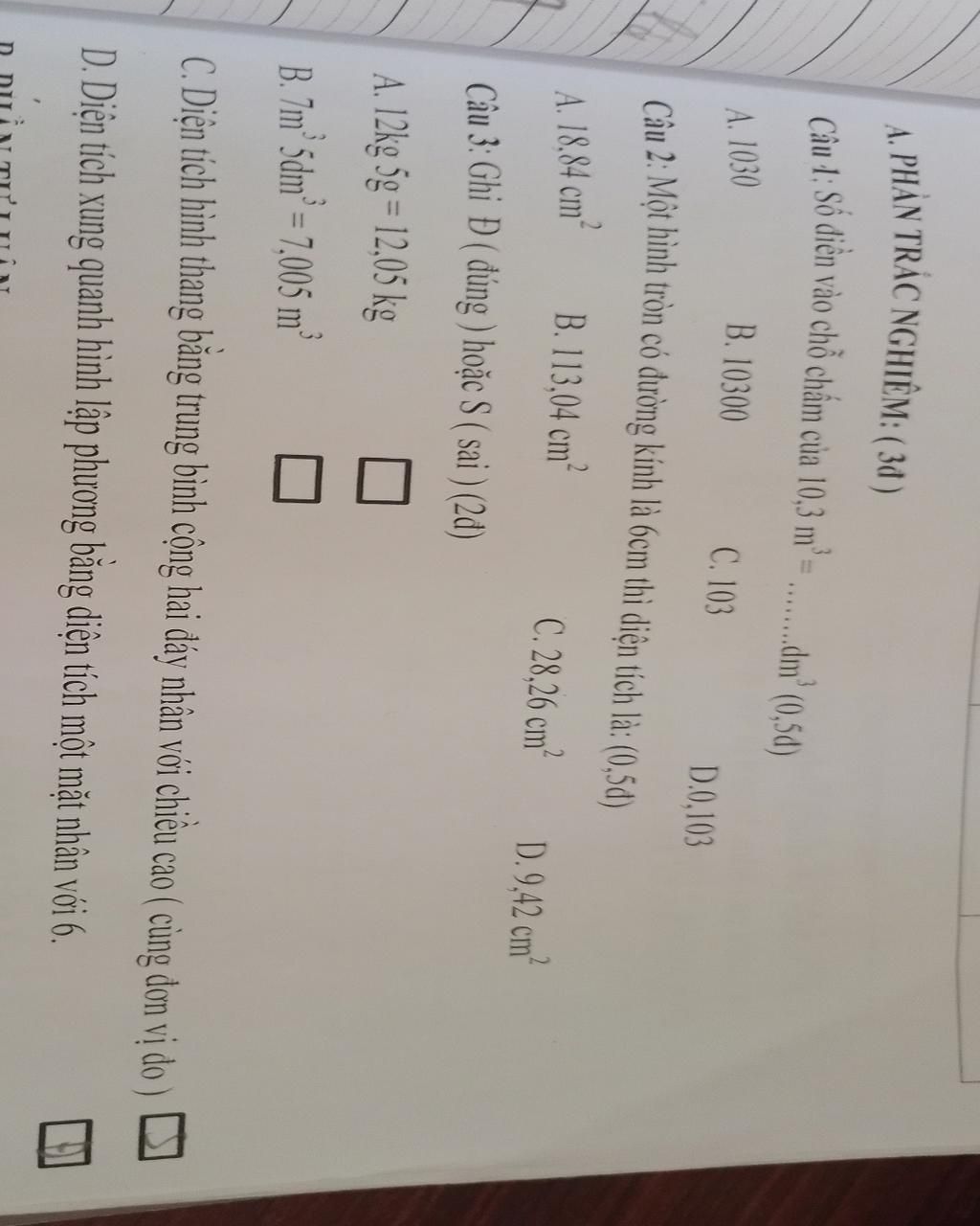 Câu 1: 10,3 m³ = 0,103 dm³ ⇒ Đáp án A