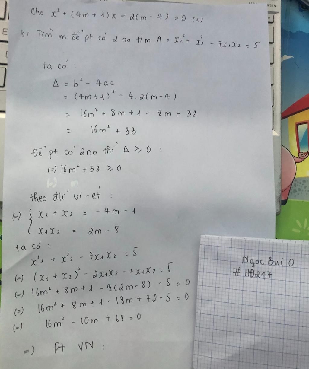 KL: Vậy ko có giá trị nào của m để pt (1) có 2 nghiệm t/m A= x1^2+x2^2-7x1x2=5