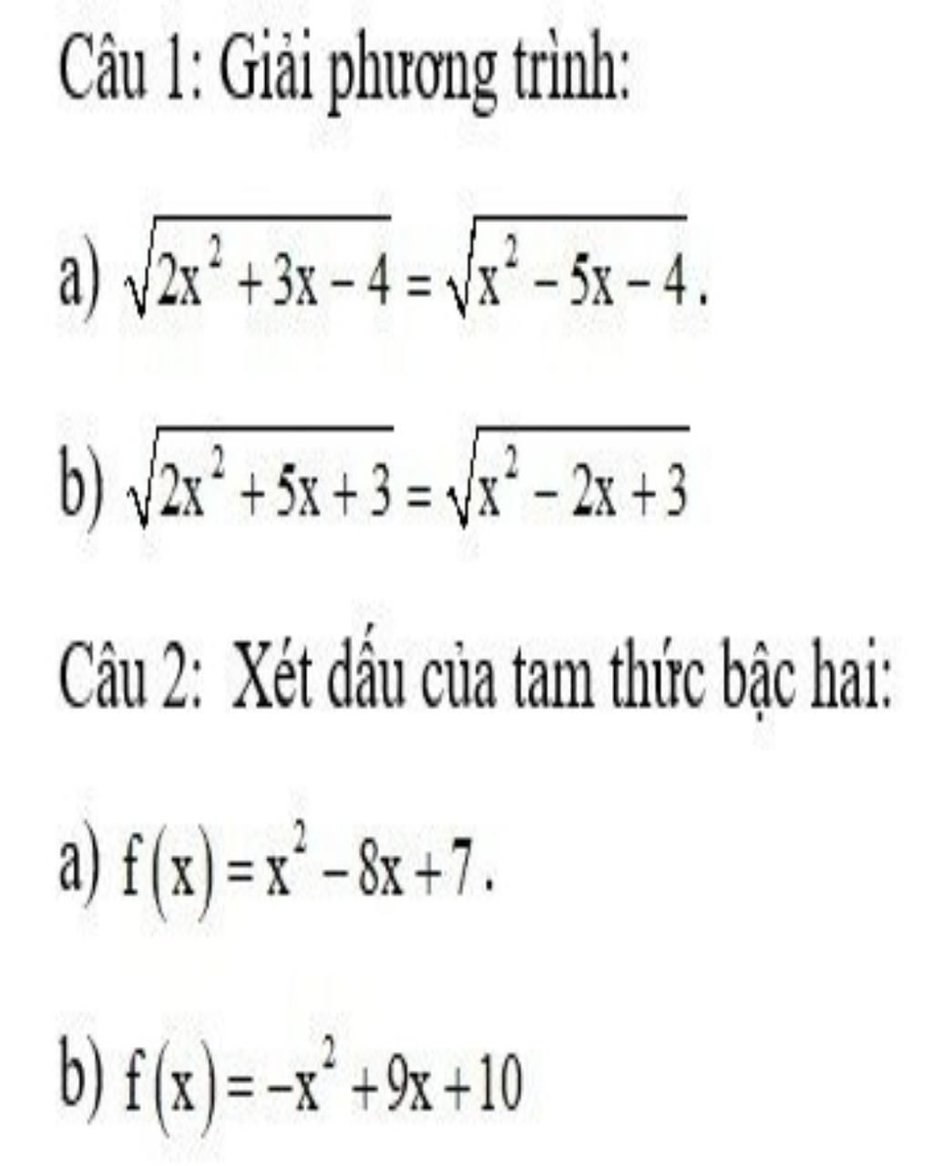 `a)``\sqrt{2x^{2}+3x-4}=\sqrt{x^{2}-5x-4}``(ĐK: x≤ \frac{5-\sqrt{41}}{2}; x≥\frac{5+\sqrt{41}}{2})`