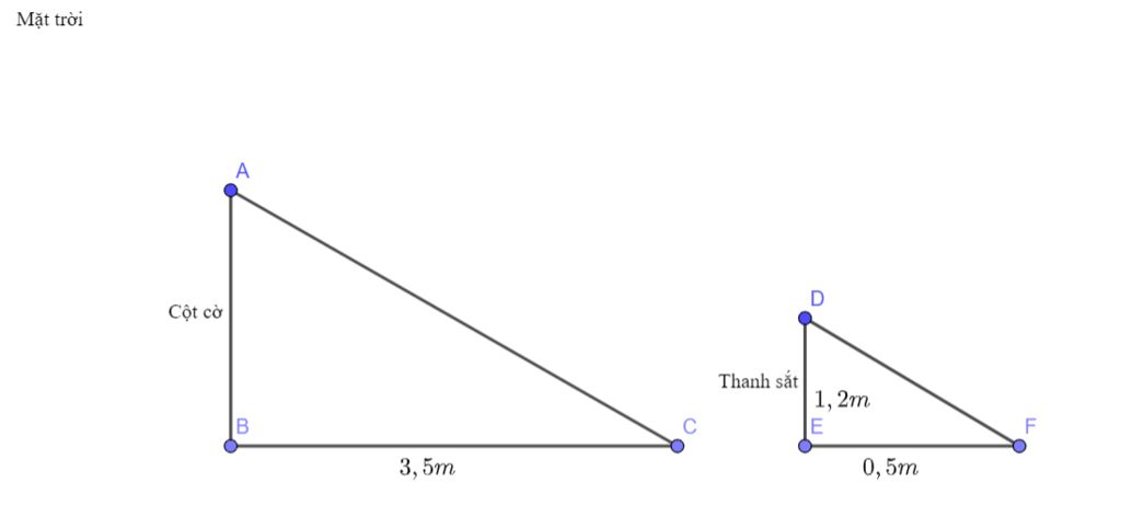 Do xét trên cùng một thời điểm nên tam giác tạo bởi bóng của cột cờ, tia sáng mặt trời và cột cờ đồng dạng với tam giác tạo bởi bóng của thanh sắt, tia sáng mặt trời và thanh sắt