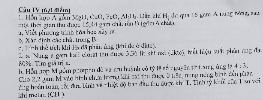 $\rm c)\\m_{O}=16-15,44=0,56(g)\\\xrightarrow[]{}n_{O}=\dfrac{0,56}{16}=0,035(mol)\\\xrightarrow[]{}n_{H_2O}=n_{O}=0,035(mol)\\\xrightarrow[]{TheoPTHH}n_{H_2}=n_{H_2O}=0,035(mol)\\\xrightarrow[]{}V_{H_2}=0,035\times22,4=0,784(l)$