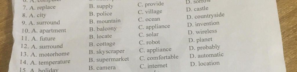 15. D (trọng âm rơi vào âm thứ hai, còn lại trọng âm rơi vào âm thứ nhất)