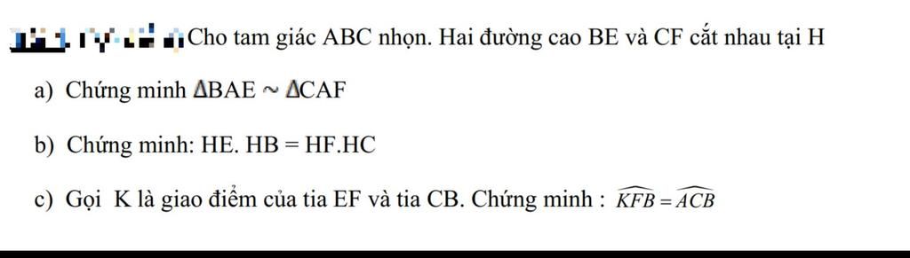 âi Cho tam giác ABC nhọn. Hai đường cao BE và CF cắt nhau tại H
