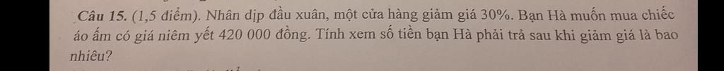 Câu 15. (1,5 điểm). Nhân dịp đầu xuân, một cửa hàng giảm giá 30%. Bạn Hà muốn mua chiếc
