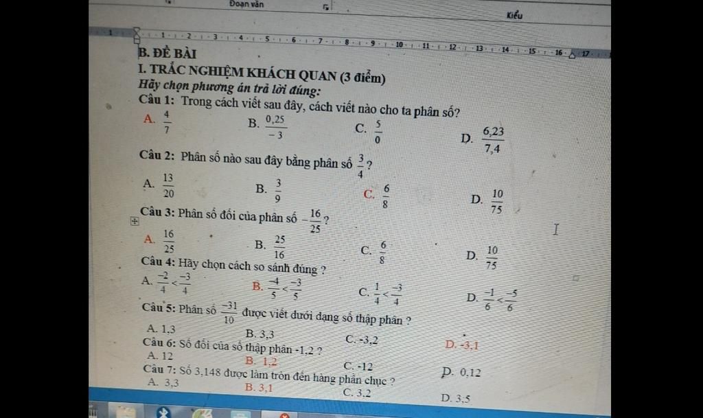 Câu 1: Trong cách viết sau đây, cách viết nào cho ta phân số?