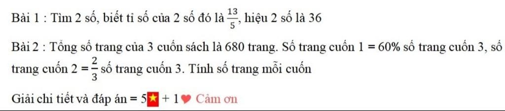 Bài 1 : Tìm 2 số, biết tỉ số của 2 số đó là , hiệu 2 số là 36