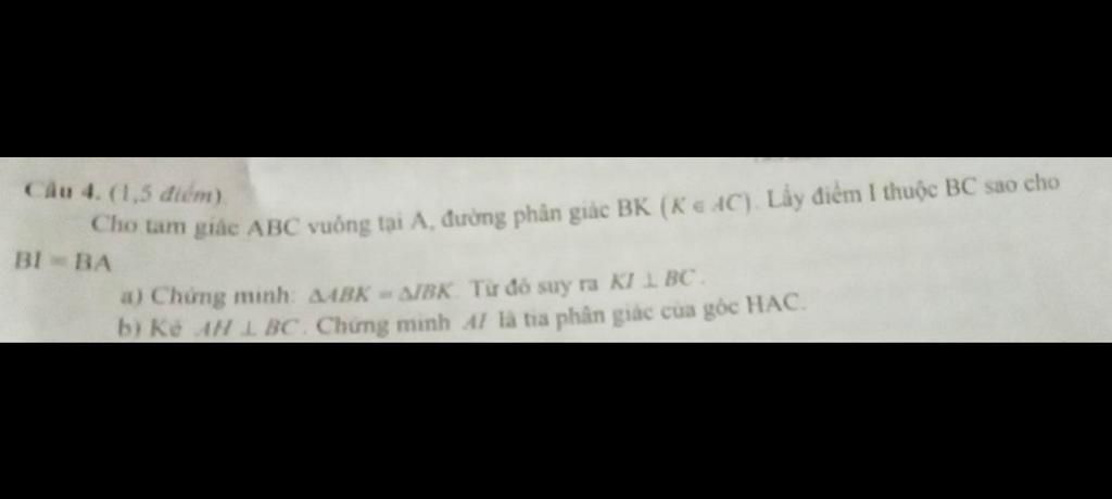 Cho tam giác ABC vuông tại A, đường phân giác BK (K = 4C). Lấy điểm I thuộc BC sao cho