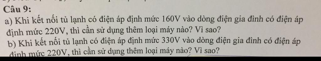 `b)` Dúng máy biến áp để tăng áp từ `220V` lên `330V` để phù hợp với điện áp định mức của tủ lạnh tránh điện áp quá thấp làm giảm hiệu suất làm lạnh, tăng mức độ tiêu thụ điện.