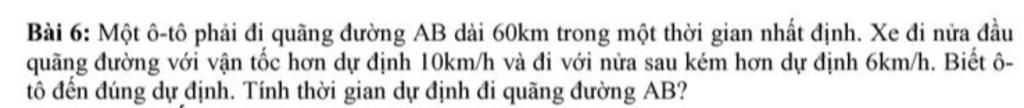 Gọi` x(km`/`h) `là vận tốc dự định của ô tô` (đk: x>6)`