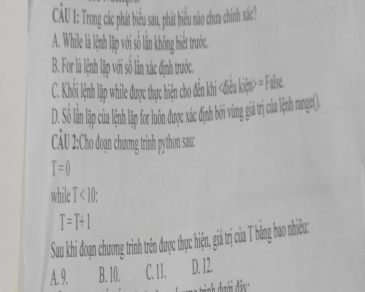 Câu 1 : C.Khối lệnh lặp While được thực hiện cho đến khi <điều kiện>=False