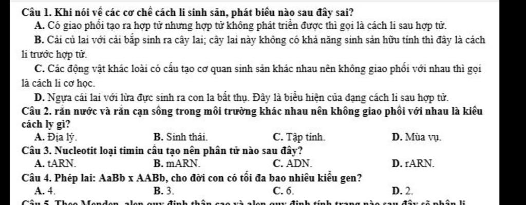 Câu 1. Khi nói về các cơ chế cách li sinh sản, phát biểu nào sau đây sai?