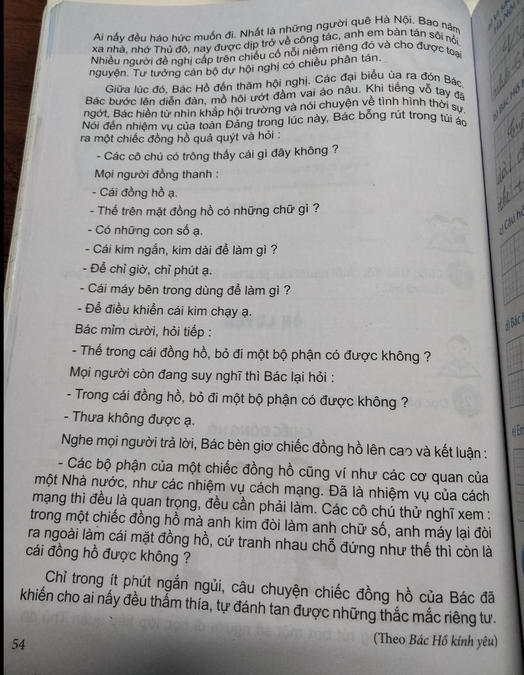 b, Bác Hồ mượn câu chuyện về chiếc đồng hồ để nói rằng chiếc đồng hồ cứ tựa như các cơ quan của một nhà nước, như các công việc cách mạng vậy. Đã là nhiệm vụ của cách mạng thì đều rất quan trọng, đều cần phải làm.