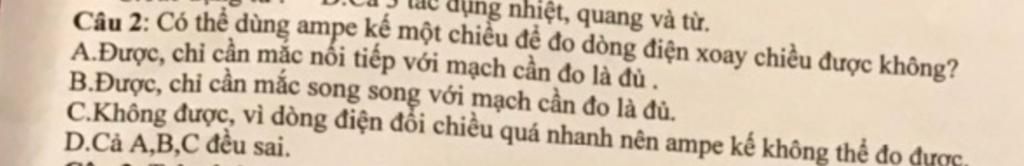 Dùng Ampe kế một chiều do cường độ dòng điện xoay chiều thì đó dòng điện đổi chiều liên tục nên kim Ampe kế cũng đuổi chiều liên tục, nhưng do quán tính, kim Ampe kế không kịp đổi chiều, do đó nó nằm im tại chỗ.