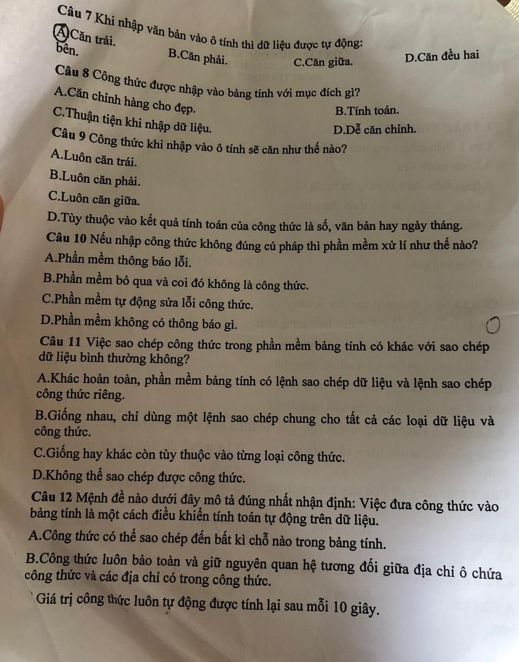 Câu 12 Mệnh đề nào dưới đây mô ta đúng nhận định : Việc đưa công thức vào bảng tính là một cách điều khiển tính toán tự đông trên dữ liệu .