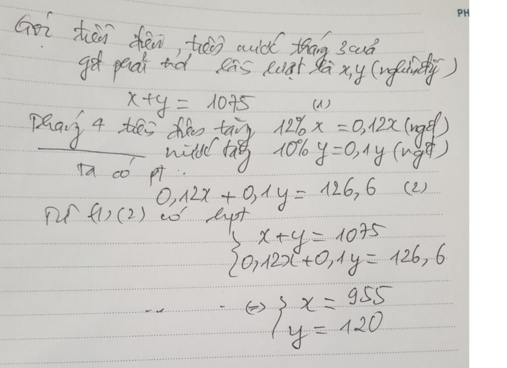Đáp án: tiền điện: x= 925 000; tiền nước: y= 150 000 (VNĐ)