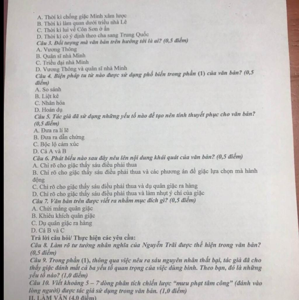 câu 1: Văn bản trên thuộc thể loại nào sau đây trong sự nghiệp sáng tác của Nguyễn Trãi?
