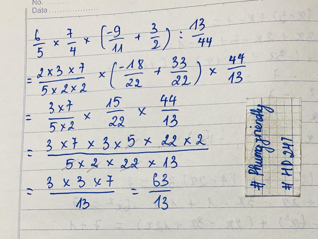 `6/5 xx 7/4 xx (-9/(11) + 3/2) : (13)/(44)`
