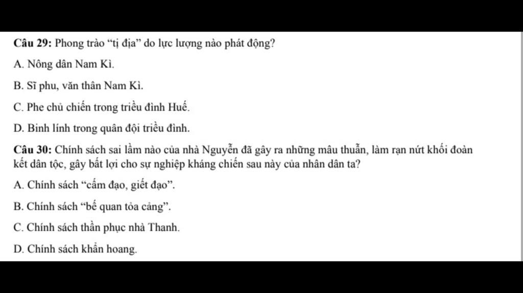 Câu 30: Chính sách sai lầm nào của nhà Nguyễn đã gây ra những mâu thuẫn, làm rạn nứt khối đoàn kết dân tộc, gây bất lợi cho sự nghiệp kháng chiến sau này của nhân dân ta?