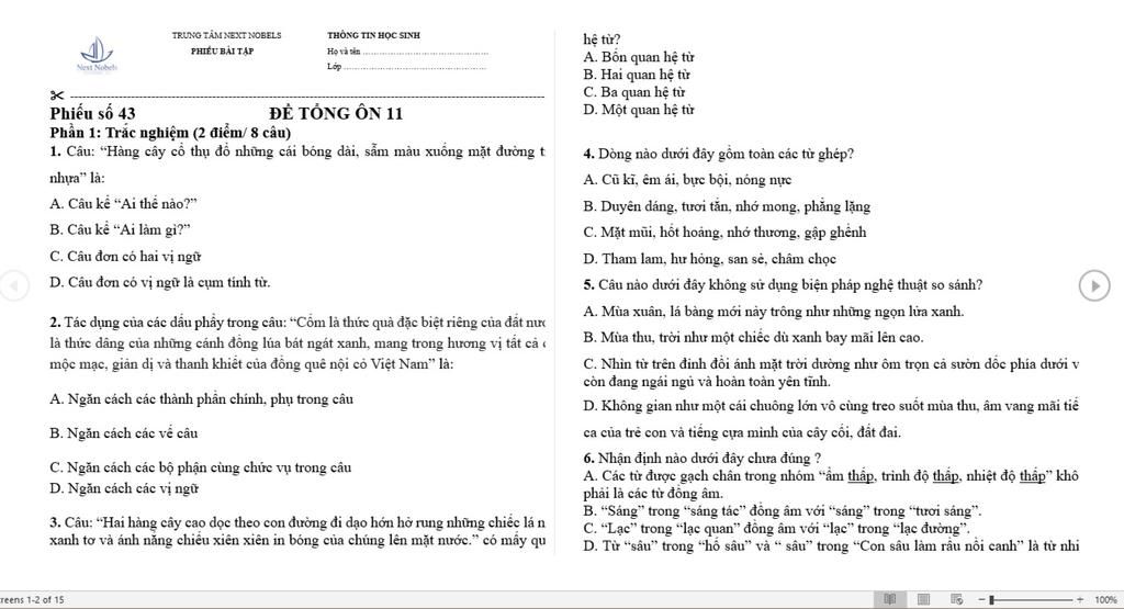 Phần 1: Trắc nghiệm (2 điểm/ 8 câu)