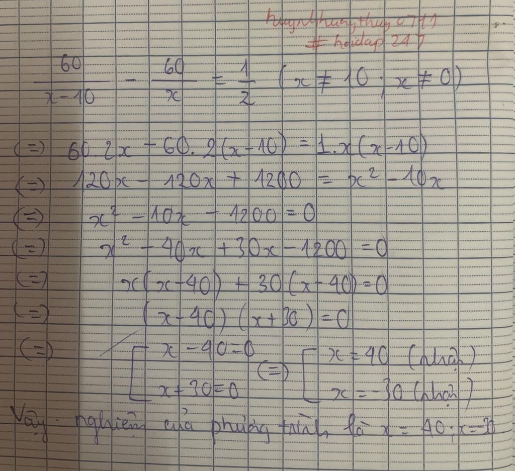 `⇔(60.x)/(x(x-10)) - (60(x-10))/(x(x-10)) = 1/2`