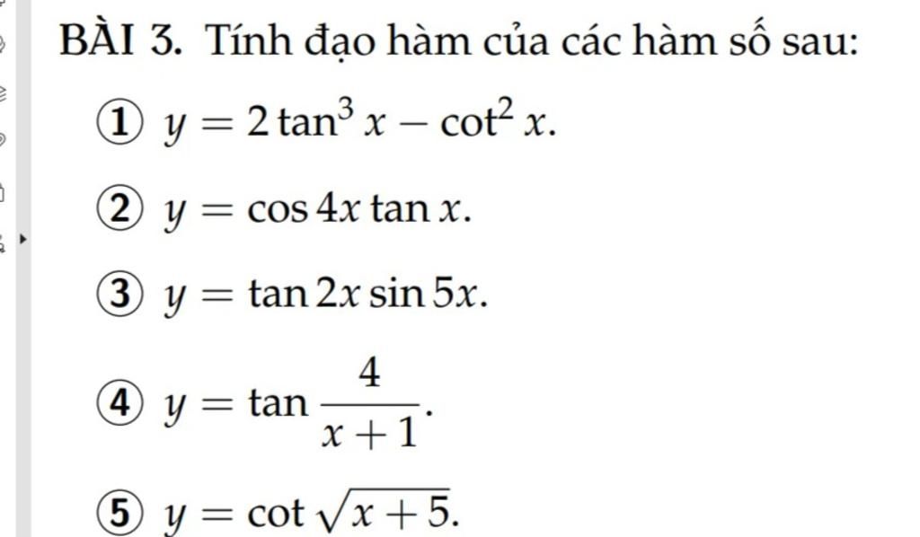$1)\\ y=2\tan^3x-\cot^2x\\ y'=6\tan^2x.(\tan x)'-2\cot x. (\cot x)'\\ =6\tan^2x(\tan^2x+1)+2\cot x (\cot^2x+1)\\ 2)\\ y=\cos 4x \tan x\\ y'=(\cos 4x)' \tan x+\cos 4x( \tan x)'\\ =-\sin 4x.(4x)'. \tan x+\cos 4x(\tan^2x+1)\\ =-4\sin 4x \tan x+\cos 4x(\tan^2x+1)\\ 3)\\ y=\tan 2x \sin 5x\\ y'=(\tan 2x)' \sin 5x+\tan 2x( \sin 5x)'\\ =(\tan^22x+1).(2x)' .\sin 5x+\tan 2x. \cos 5x.(5x)'\\ =2(\tan^22x+1)\sin 5x+5\tan 2x \cos 5x\\ 4)\\ y=\tan\dfrac{4}{x+1}\\ y'=\left(\tan^2\dfrac{4}{x+1}+1 \right). \left(\dfrac{4}{x+1}\right)'\\ =\left(\tan^2\dfrac{4}{x+1}+1 \right). \dfrac{-4}{(x+1)^2}.(x+1)'\\ =-\dfrac{4\left(\tan^2\dfrac{4}{x+1}+1 \right)}{(x+1)^2}\\ 5)\\ y=\cot \sqrt{x+5}\\ y'=(\cot^2\sqrt{x+5}+1).(\sqrt{x+5})'\\ =-(\cot^2\sqrt{x+5}+1).\dfrac{(x+5)'}{2\sqrt{x+5}}\\ =-\dfrac{\cot^2\sqrt{x+5}+1}{2\sqrt{x+5}}.$