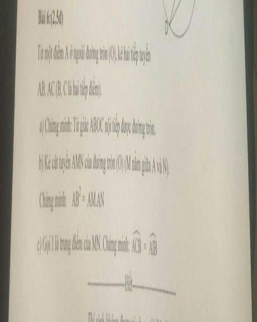 a) Chứng minh: Tứ giác ABOC nội tiếp được đường tròn. b) Kẻ cát tuyến AMN của đường tròn (O) (M nằm giữa A và N). Chứng minh AB = AMAN c) Gọi I là trung điểm của MN. Chứng minh: ACB AIB
