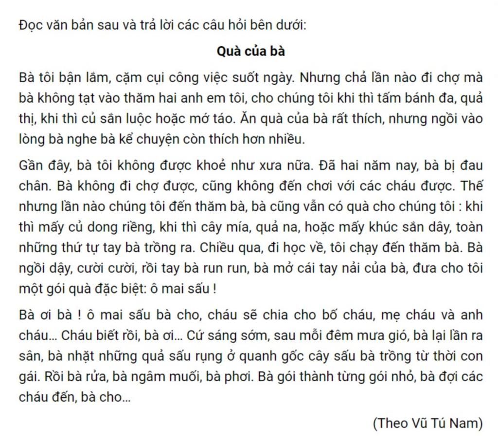 `+`Bà ngồi dậy, cười cười, rồi tay bà run run, bà mở cái tay nải của bà, đưa cho tôi một gói quà đặc biệt: ô mai sấu !