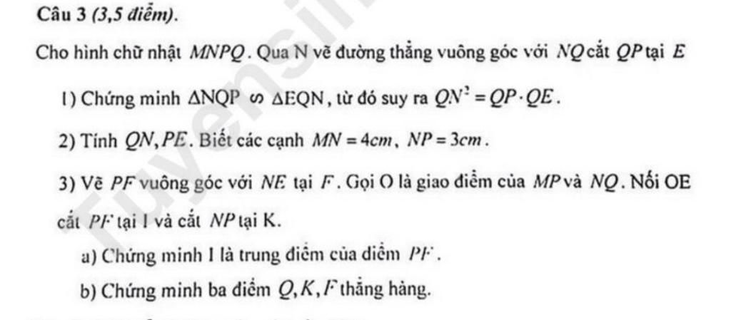 3) Vẽ PF vuông góc với NE tại F . Gọi O là giao điểm của MP và NQ. Nối OE