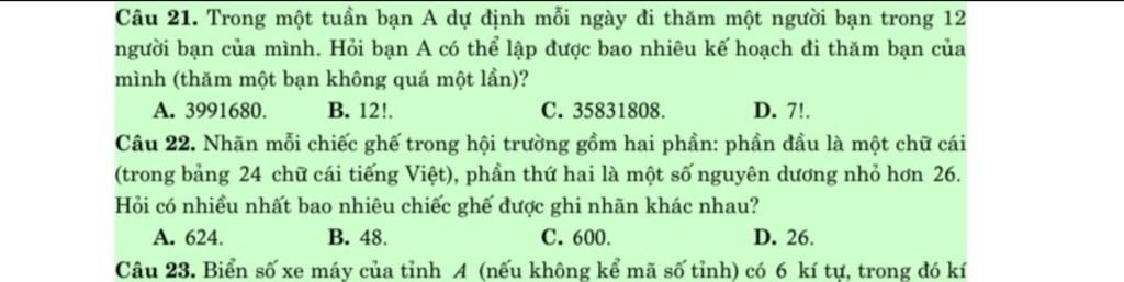Câu 21. Trong một tuần bạn A dự định mỗi ngày đi thăm một người bạn trong 12