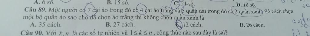 Câu 89. Một người có 7 cái áo trong đó có 4 dái áo trắng và 5 quần dài trong đó có 2 quần xanh) Só cách chọn