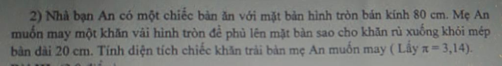 Diện tích của chiếc khăn trải bàn là: S= $R^{2}$ .π=$100^{2}$.3,14=31400 $cm^{2}$ =3,14$m^{2}$