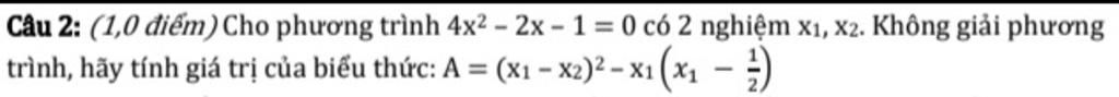 Vì pt có 2 nghiệm `x_1;x_2` nên theo hệ thức Vi-ét : $\begin{cases} x_1+x_2=\dfrac{1}{2}\\x_1x_2= -\dfrac{1}{4} \end{cases}$