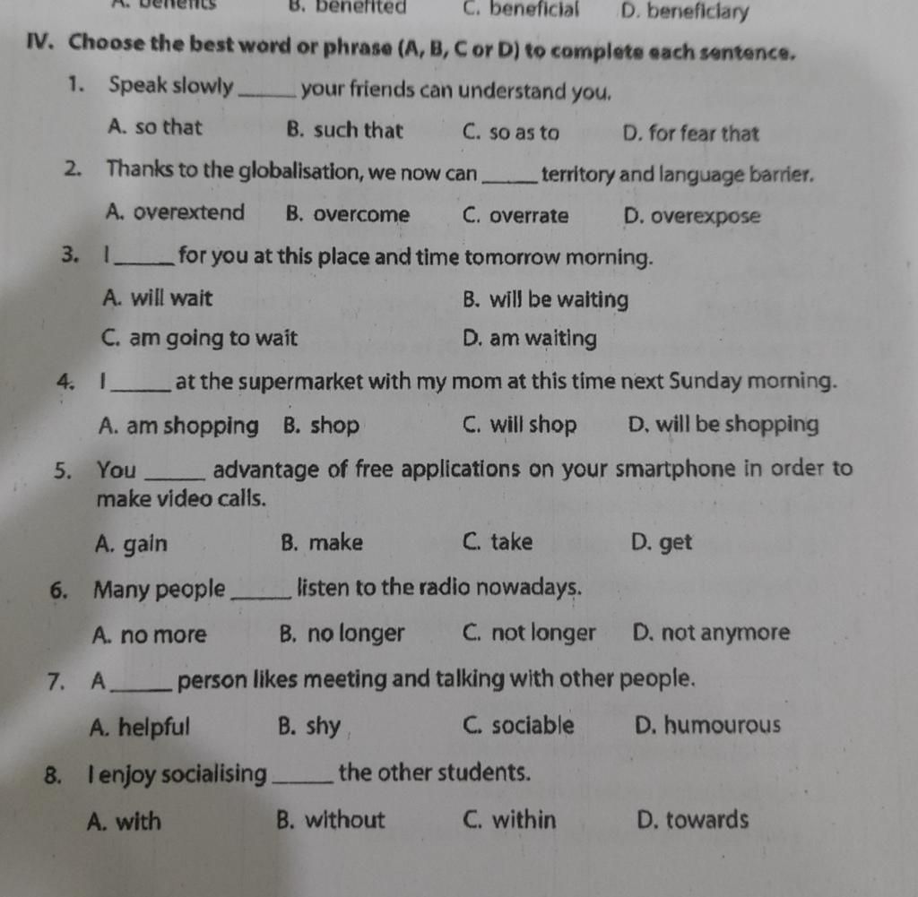 IV. Choose the best word or phrase (A, B, C or D) to complete each sentence.