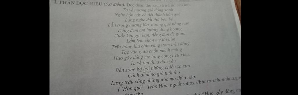 I. PHÂN ĐỌC HIỂU (5,0 điểm), Đọc đoạn thơ sau và trả lời câu hỏi