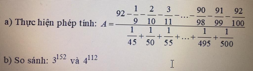 `A=(92 - 1/9 - 2/10 - 3/11 - ... - 90/98 - 91/99 - 92/100)/(1/45 + 1/50 + 1/55 + ... + 1/495 + 1/500`
