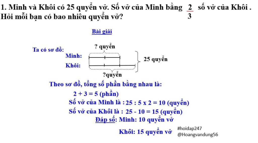 Đáp số: Minh : `10` quyển vở ; Khôi: `15` quyên vở