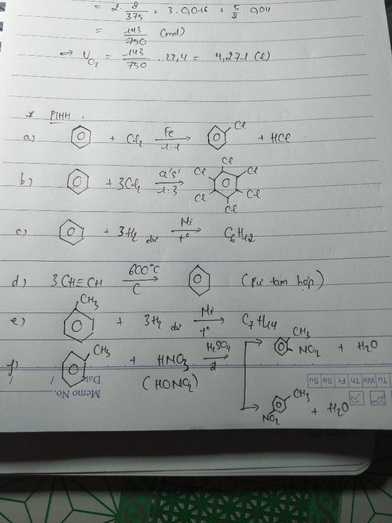 b/ benzen + Cl 2 xúc tác ánh sáng , tỉ lệ mol 1:3.