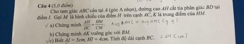 b.Ta có: $\Delta ABC$ cân tại $A, AH\perp BC\to H$ là trung điểm $BC$