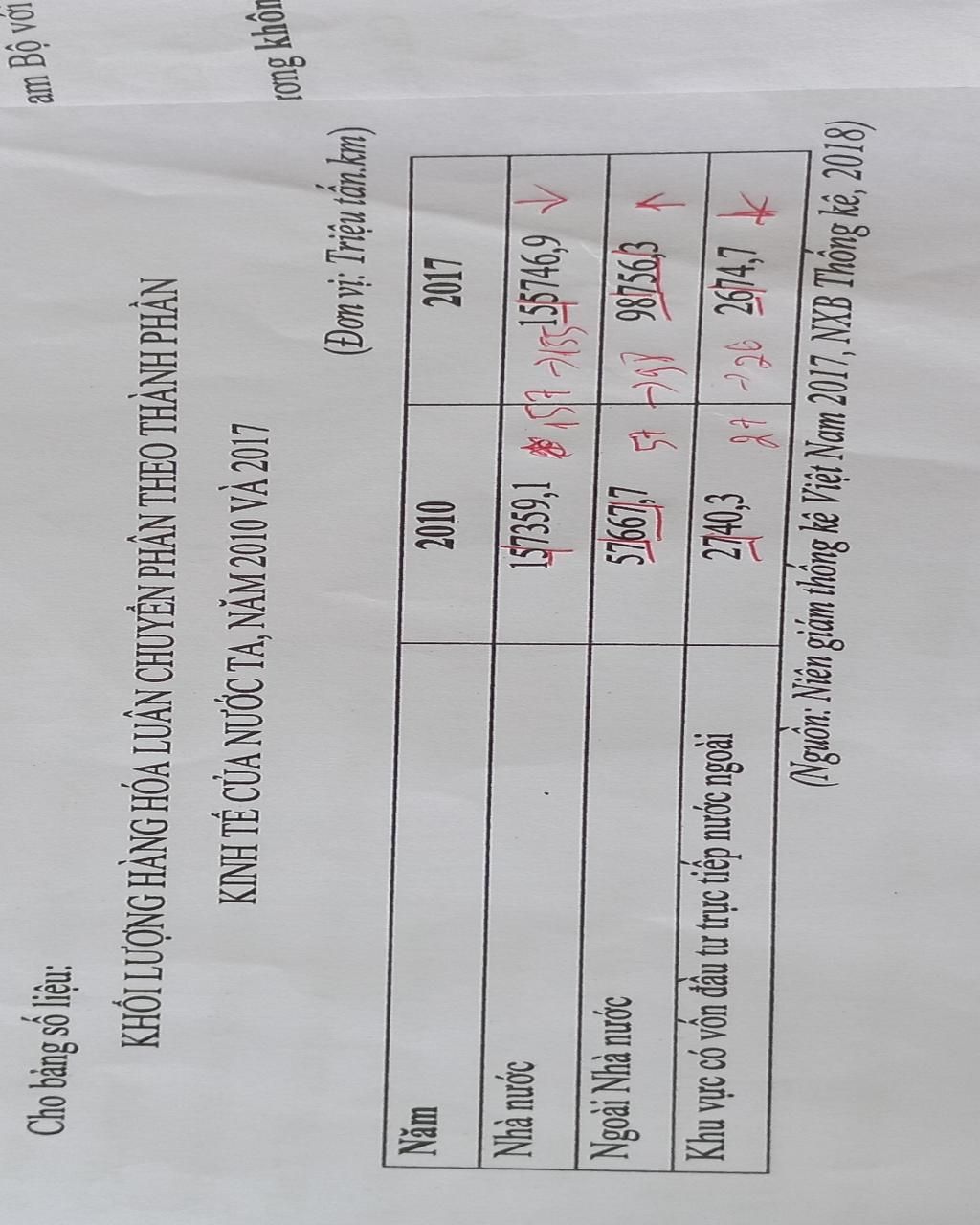 Theo bảng số liệu nhận xét sự thay đổi cơ cấu khối lượng hàng hóa luân chuyển phân theo thành phần kinh tế của nước ta giai đoạn năm 2010 đến 2017