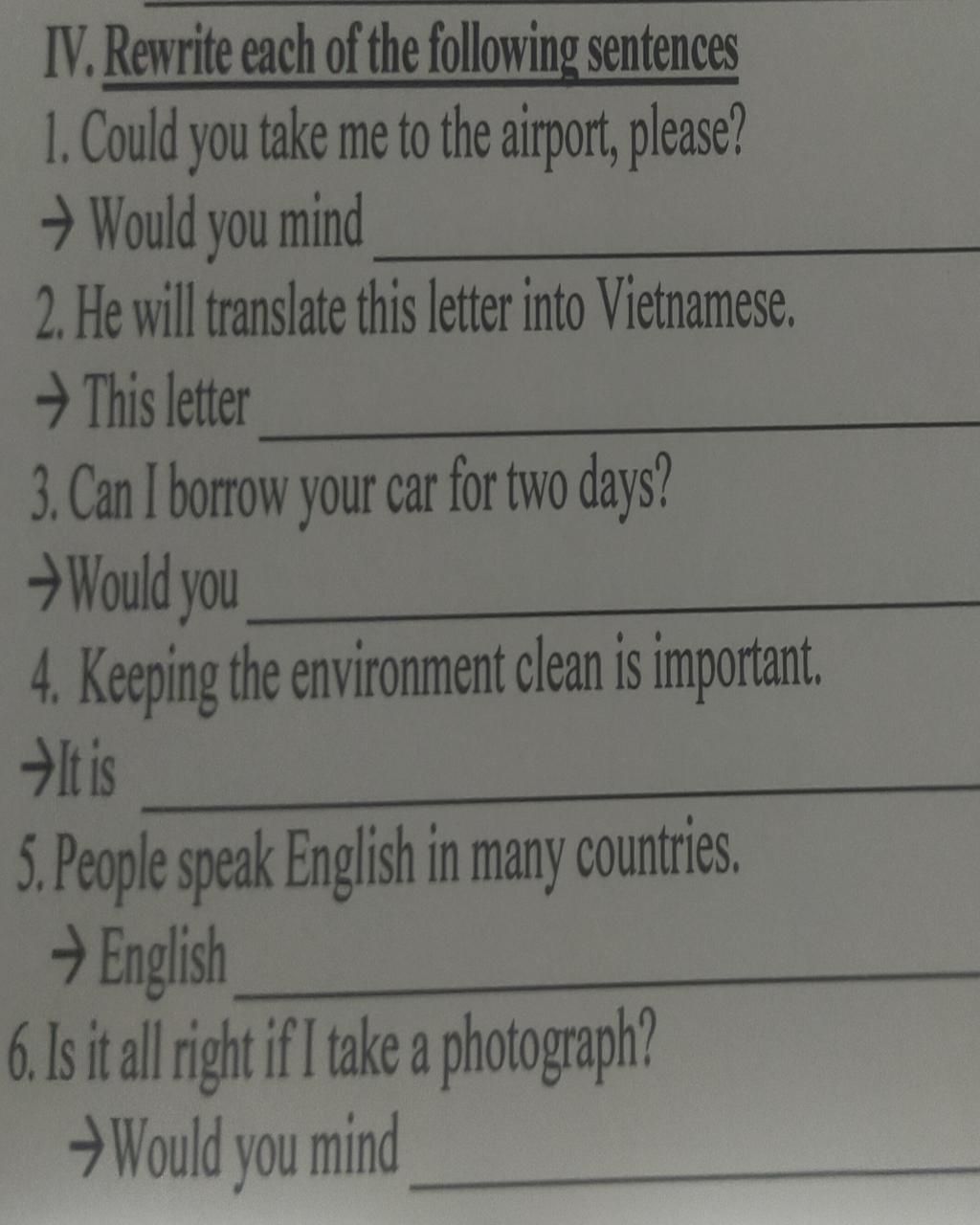 câu 6 k phải làm dạng Ving nha e vì trên đề có chủ ngữ sau là I kìa e ... áp dụng Would you mind + if + S +V2/ed nhé